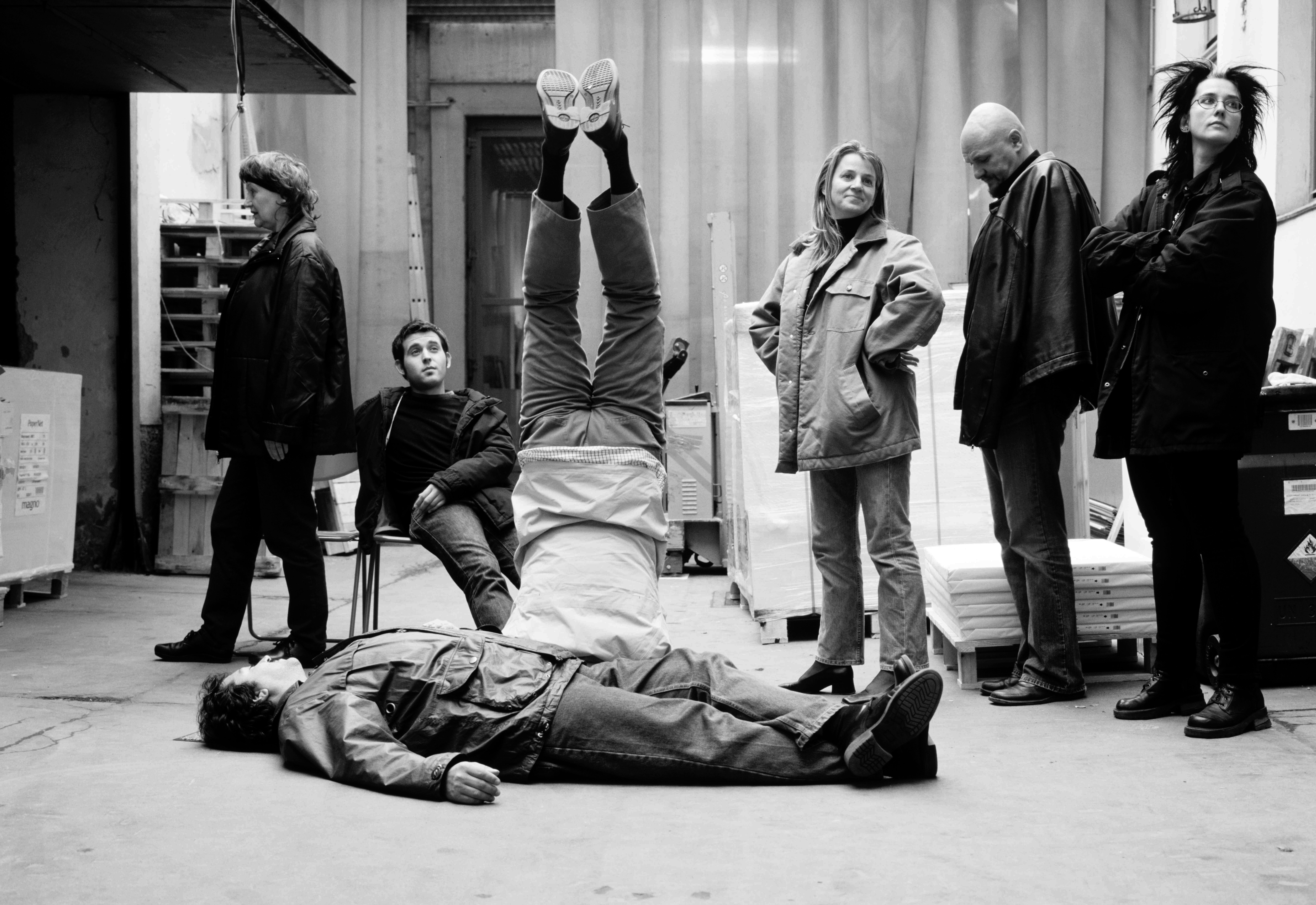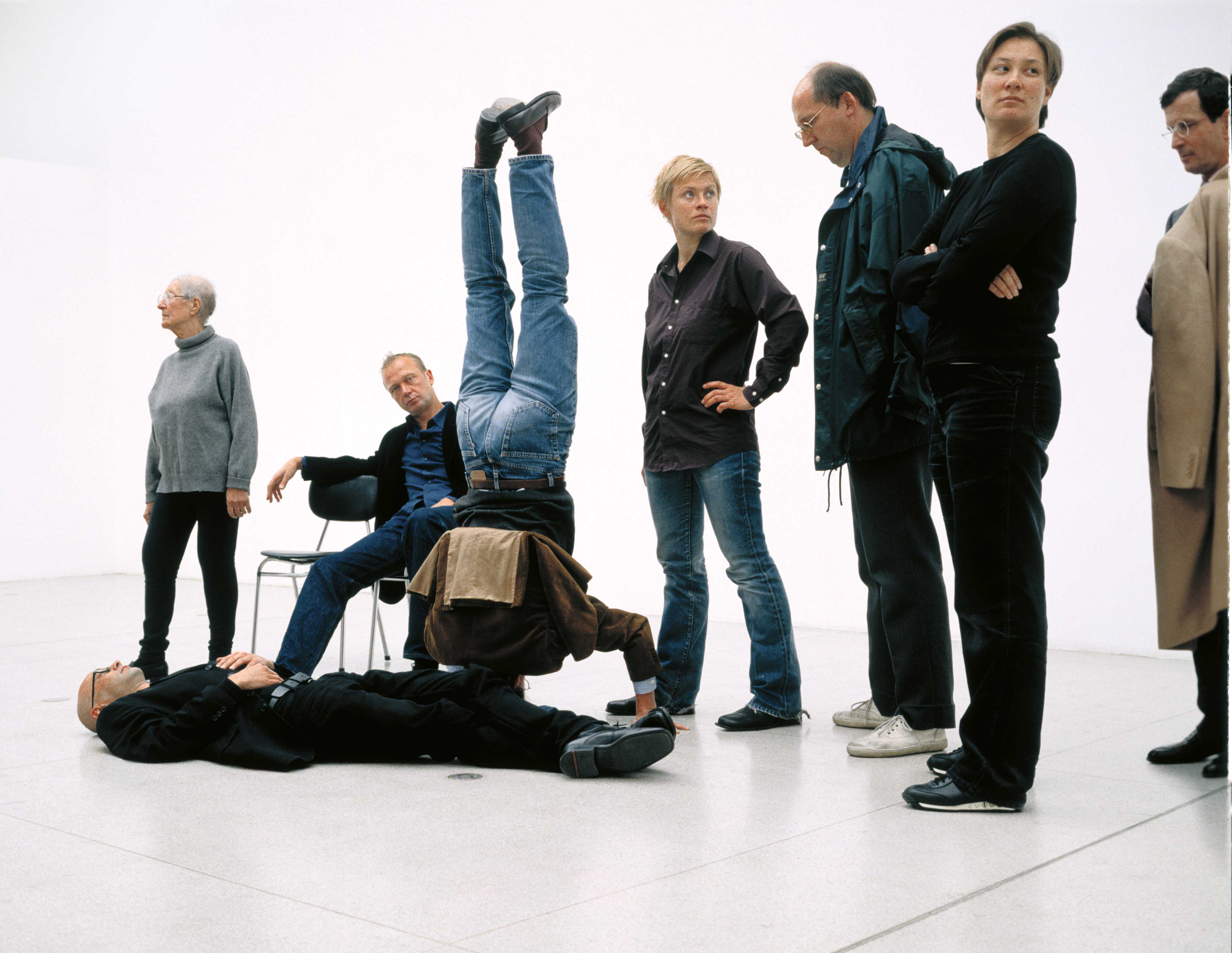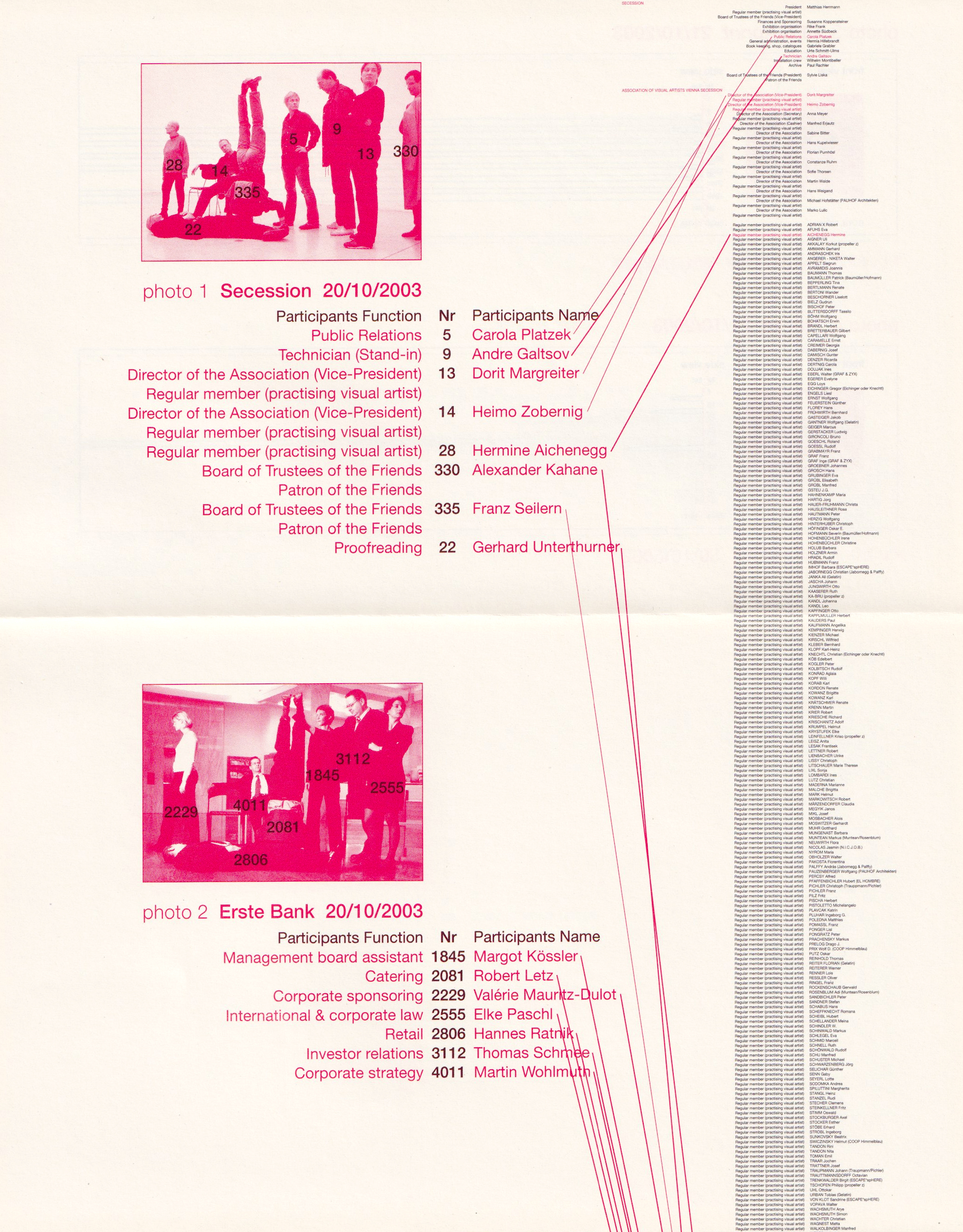 STAND-IN (2003) visualizes and maps but also reshuffles the connections between the members of a group. By working with pre-determined formal decisions subdued social relations come to the surface and new ones emerge. The project comprises diagrams, folders and four photographic group portraits. Those portrayed in the photos form part of the extended network of Secession, an artists’ association and exhibition house in Vienna. The seven painters, bankers, printers, and members or employees of the Secession are photographed in their own working environment and chosen on a random basis (two from the top of the list provided, two from the bottom and three from the middle). A 1988 photograph of seven friends titled Sessions no. 06 functions as a blueprint for the composition of the group portraits.