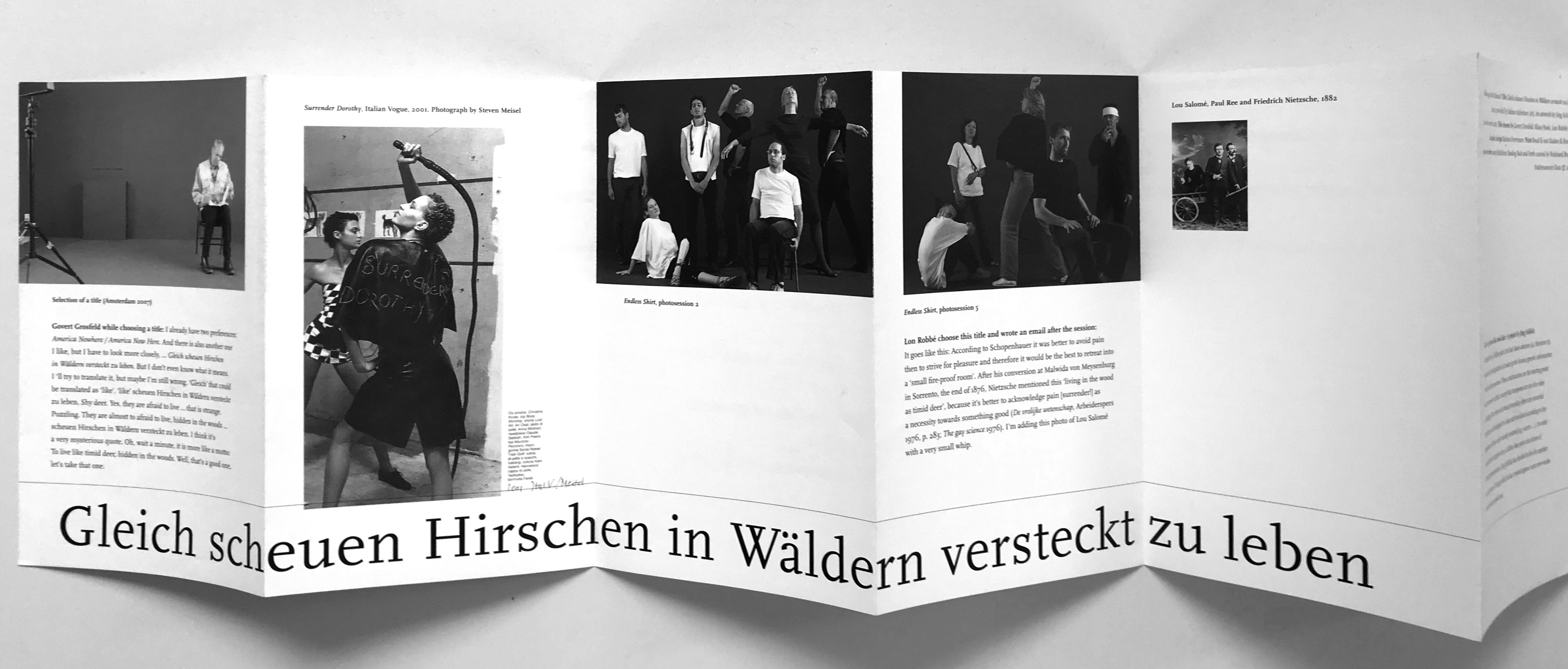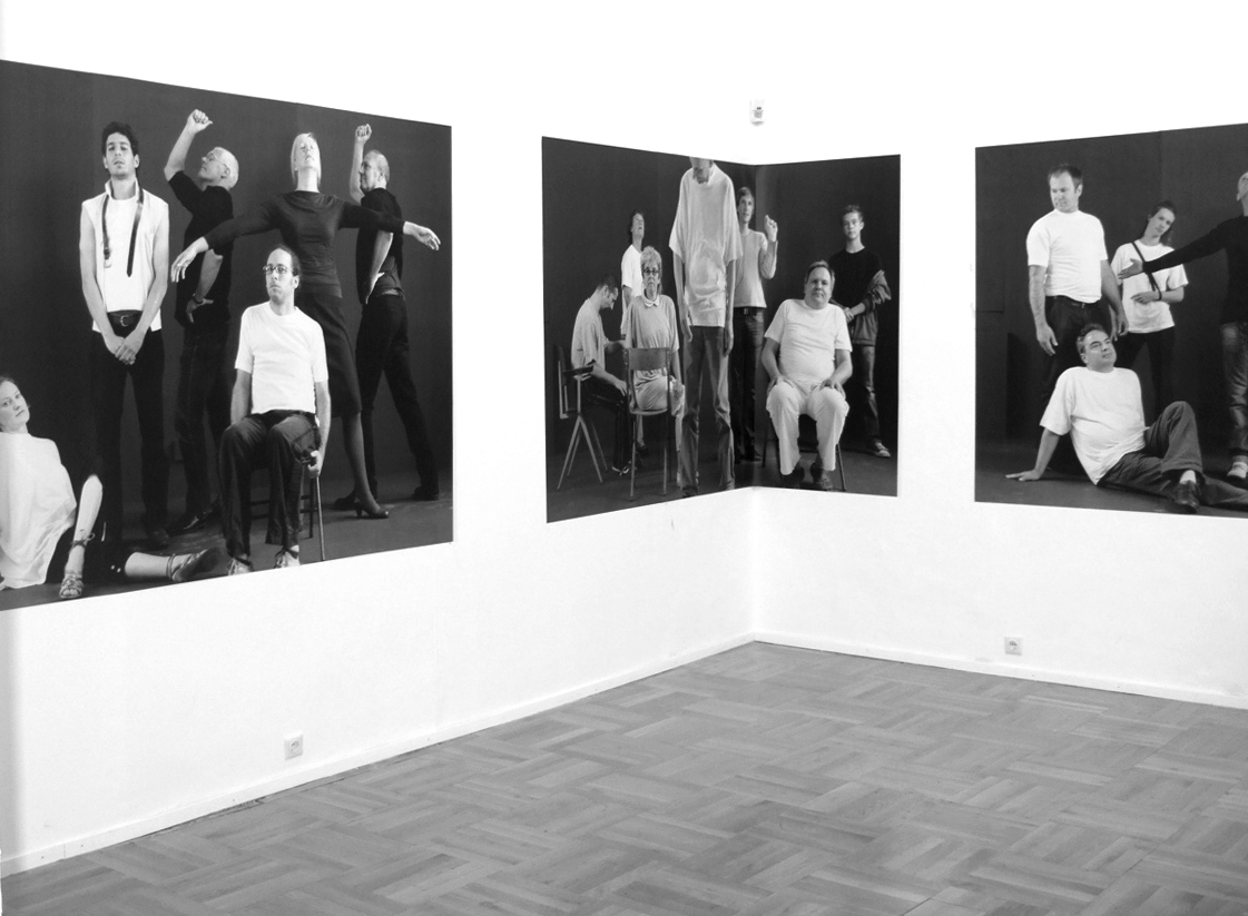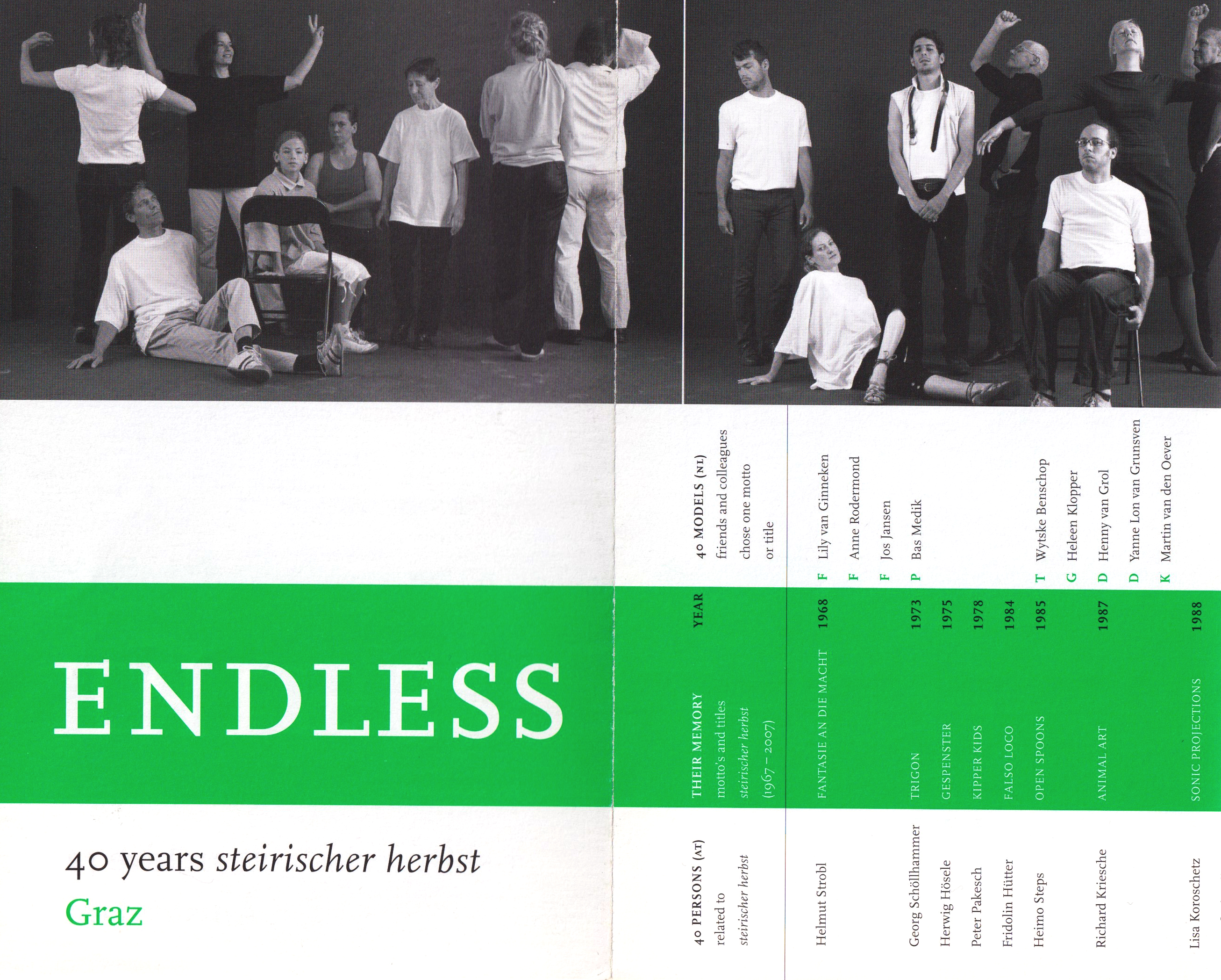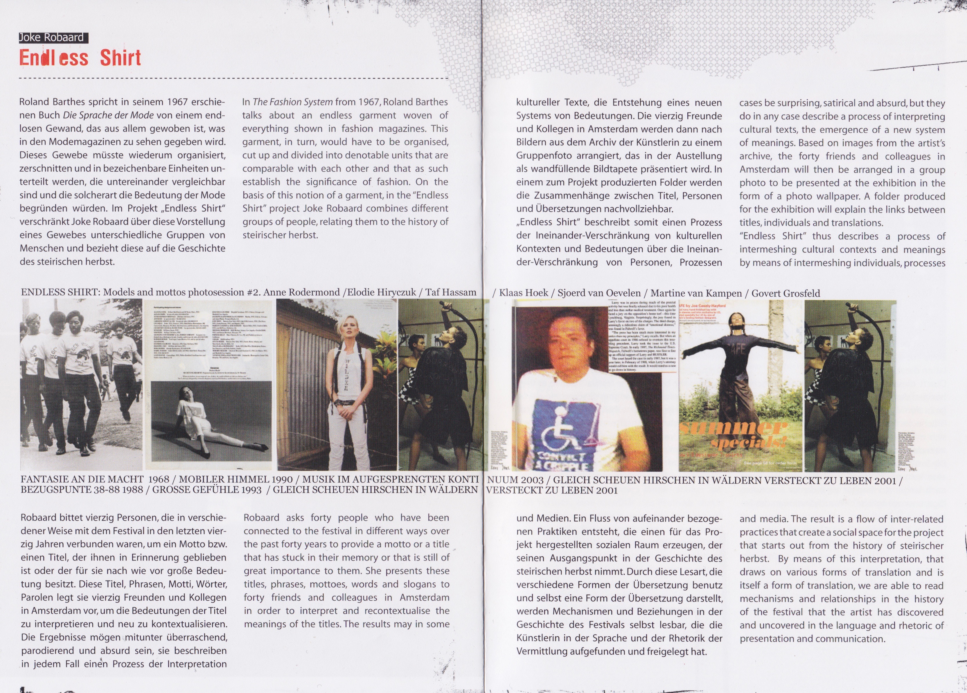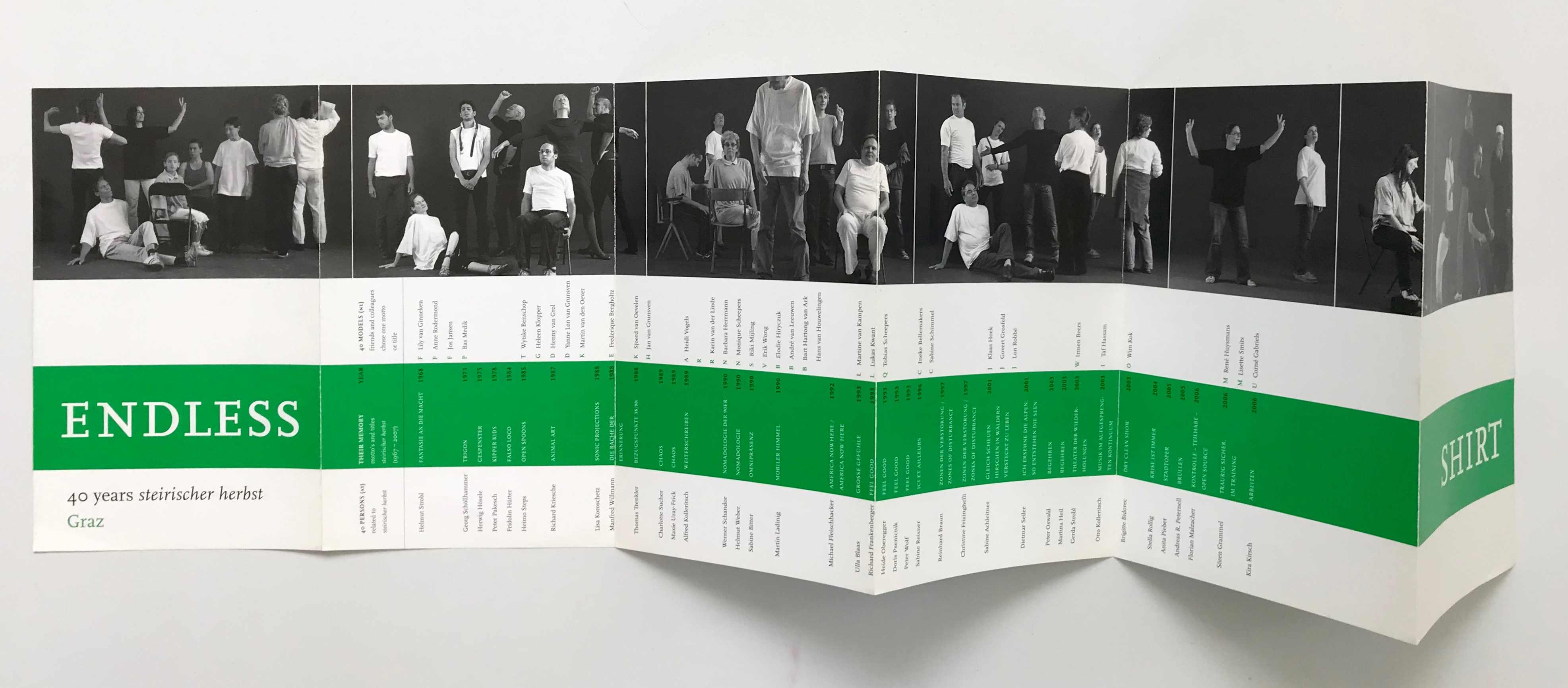 ENDLESS SHIRT (2007) was developed for the forty-year anniversary of the interdisciplinary festival steirischer herbst in Graz, Austria. Through an intricate translation process based on memories and associations, the project reflects upon key words still stored in people's minds. Forty affiliates of the festival were asked to send a title or motto from past editions that they appreciated. From this list forty Amsterdam-based friends chose a phrase that resonated with them. Based on the year corresponding to the selected phrases, the friends were matched with a pose related to images from the T-shirts & Text folder of Archive Intersections. The ‘Amsterdam’ models, dressed in plain T-shirts, would re-enact these poses for a series of group portraits, shown at the exhibition Reading Back and Forth, curated by Reinhard Braun